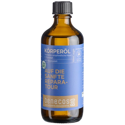 Das wertvolle, kaltgepresste benecosBIO-Baobaböl eignet sich gut für trockene, empfindliche Haut. Es repariert geschwächte, gestörte Hautbarrieren und unterstützt zudem den Heilungsprozess bei Schuppenflechte, Akne sowie bei Entzündungen und Sonnenbrand. Gleichzeitig wirkt es als Schutz vor lichtbedingter Hautalterung und pflegt rissige Nägel und glanzloses Haar. Nutzt man es als Massageöl, hinterlässt es ein geschmeidiges Gefühl.