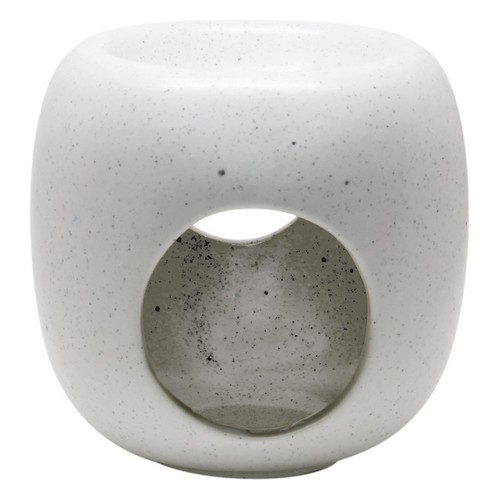 Formschöne, harmonische Teelicht-Duftlampe zur Verdunstung ätherischer Öle in die Raumluft. Aus weisser Keramik mit unregelmässig gepunkter Glasur, Höhe 10,5 cm. Enthält keine Kerze; für diese Duftlampe darf ausschließlich ein herkömmliches Teelicht verwendet werden.