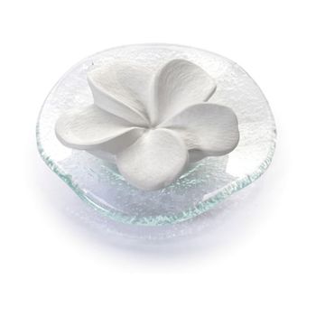 Der Duftstein Frangipani aus Terracotta wird mit einem hübschen Glasteller als Untersatz geliefert.