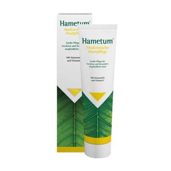 Hametum Medizinische Hautpflege ist die sanfte Pflegecreme für trockene und besonders empfindliche, beanspruchte Haut. Sie ist auf Basis von Hamamelis-Destillat hergestellt und pflanzlichen Ursprungs. Hametum Medizinische Hautpflege hilft Ihrer Haut zweifach: Die feuchtigkeitsspendende, intensiv pflegende Creme-Grundlage, eine Öl-in-Wasser (O/W)-Emulsion und das entzündungshemmende Hamamelis-Destillat beruhigen die Haut und unterstützen die Regeneration der oberen Hautschicht. So steigt z.B. der Wassergehalt der Zellen der oberen Hautschicht an, die Rötung und der Juckreiz lassen nach und die Haut wird geschmeidiger und glatter. Das in der Creme-Grundlage enthaltene Vitamin E gilt als sogenanntes Antioxidans und schützt die Haut vor der Oxidation durch Sauerstoffradikale. Es wirkt hautpflegend, bindegewebsfestigend und zellerneuernd. Das enthaltene hochwertige Distelöl wirkt besonders pflegend und rückfettend und hat gleichzeitig einen glättenden Effekt.