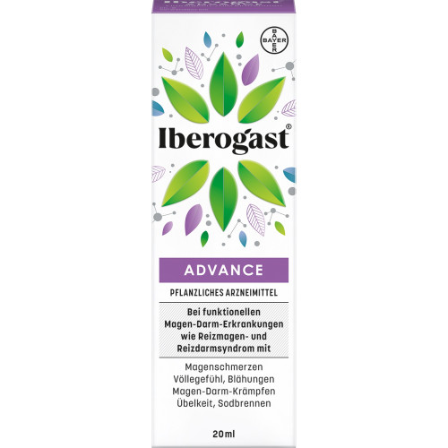 Iberogast® ADVANCE. Pflanzliches Arzneimittel bei Magen-Darm-Erkrankungen. Behandlung von funktionellen Magen-Darm-Erkrankungen wie Reizmagensyndrom (funktionelle Dyspepsie) und Reizdarmsyndrom (Colon irritabile). Das Arzneimittel enthält 31 Vol.-% Alkohol. Stand: 12/2020. Bayer Vital GmbH, Kaiser-Wilhelm-Allee 70, 51373 Leverkusen, Deutschland.