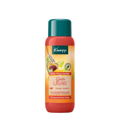Mit dem fruchtig heiter duftenden Kneipp® Aroma-Pflegeschaumbad Gute Laune mit natürlichen Ölen aus Maracuja und Grapefruit löst sich Trübsal in Luft auf. Genießen Sie unbeschwert einen Moment des Glücks. Sein exotischer Duft belebt die Sinne und zaubert ein Lächeln auf Ihr Gesicht. Natürliches pflegendes Öl macht die Haut zart und geschmeidig. Das Zusammenspiel von fröhlichem Duft, intensiver Farbe und langanhaltendem Schaum macht dieses Bad zu einem ganzheitlichen Erlebnis für die Sinne.