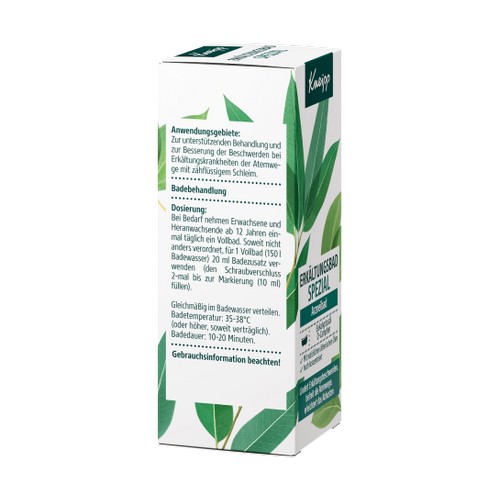 Kneipp® Erkältungsbad spezial. Wirkstoffe: Eukalyptusöl 40,0 g, D-Campher 2,5 g. Badezusatz zur Anwendung bei Erwachsenen und Heranwachsenden ab 12 Jahren. Zur unterstützenden Behandlung und zur Besserung der Beschwerden bei Erkältungskrankheiten der Atemwege mit zähflüssigem Schleim. Enthält D-Campher. Zu Risiken und Nebenwirkungen lesen Sie die Packungsbeilage und fragen Sie Ihre Ärztin, Ihren Arzt oder in Ihrer Apotheke.