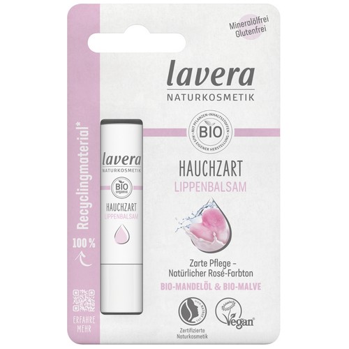 Erlebe das lavera Gefühl natürlicher Pflege für zarte Lippen. Der lavera Hauchzart Lippenbalsam mit Bio-Mandelöl und Bio-Malve pflegt die Lippen besonders weich und verleiht dabei einen natürlichen Roséton. Der Lippenbalsam bildet einen langanhaltenden Film auf der Haut, bewahrt die Lippen so vor dem Austrocknen und macht sie zart und geschmeidig. Die vegane Formel ist zudem mineralölfrei und glutenfrei.
