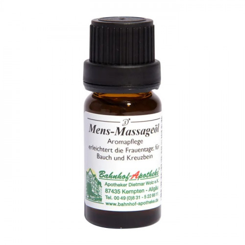 Das Mens-Massageöl aus hochwertigen naturreinen ätherischen Ölen wie Ho-Holz, Kamille römisch, Majoran, Melisse, Muskatellersalbei und Rosenholz pflegt die Haut und trägt vor und während der Menstruation zur Entspannung im Unterleib bei. Bereits Schülerinnen tragen das Massageöl sicherheitshalber in ihrer Tasche mit, so ist es allzeit bereit.