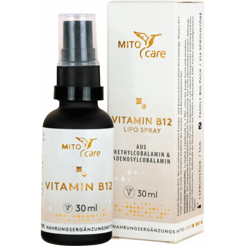 Das MITOcare add·on Vitamin B12 kombiniert die beiden beliebten Vitamin-B12-Formen Adenosylcobalamin und Methylcobalamin in einem praktischen Spray.