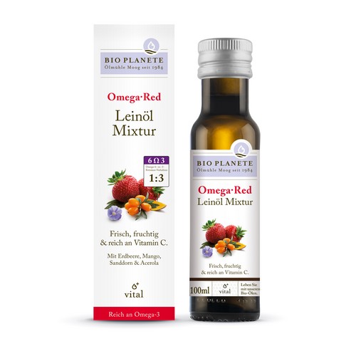 Die Leinöl Mixtur Omega Red verwöhnt mit einem außergewöhnlich fruchtigen Aroma und sorgt zudem für den täglichen Vitamin C- und Omega-3-Kick. Das Öl mit dem fruchtig-süßen Geschmack ist ideal für Joghurt, Müslis und Smoothies. Es ist besonders reich an den wertvollen Omega-3-Fettsäuren und Vitamin C.