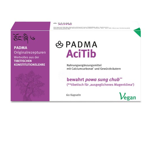 Die Verdauung ist in der Tibetische Konstitutionslehre von zentraler Bedeutung. Nur wenn die aufgenommene Nahrung vollständig zerlegt und verstoffwechselt wird, können die Nährstoffe optimal vom Körper genutzt werden. PADMA AciTib basiert auf der Originalrezeptur Cong zhi 6. Cong zhi ist tibetisch für Calcium und die Zahl 6 steht für die sechs in PADMA AciTib enthaltenen Inhaltsstoffe. Die Eigenschaften von PADMA AciTib sind charakteristisch für: